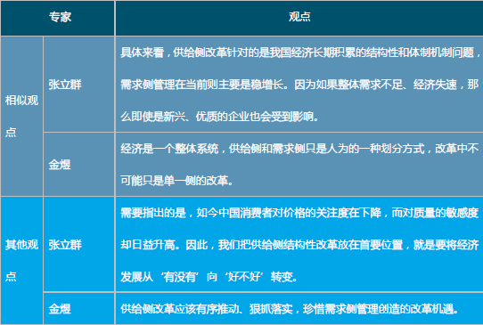 “供给侧改革”的专家观点关于“供给侧改革”的独特见解,小编整理国务院发展研究中心宏观经济研究部研究员张立群和上海财经大学经济学院经济学系主任金煜的观点,对比如下: